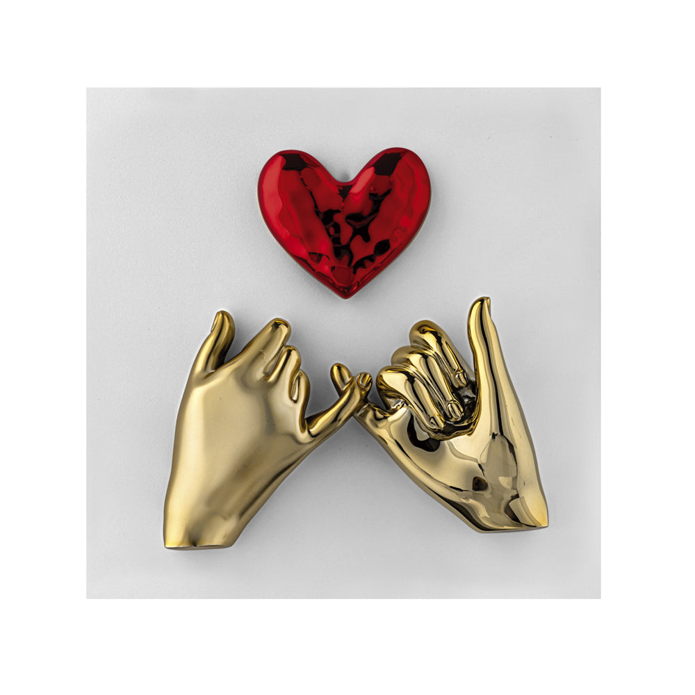 Il quadro "Mignoli" di Bongelli è un'opera che rappresenta due mani intrecciate, realizzate con una finitura dorata che aggiunge un tocco di eleganza e raffinatezza. Le linee morbide e fluide delle mani evocano un senso di unione, affetto e protezione, creando un messaggio profondo e significativo.