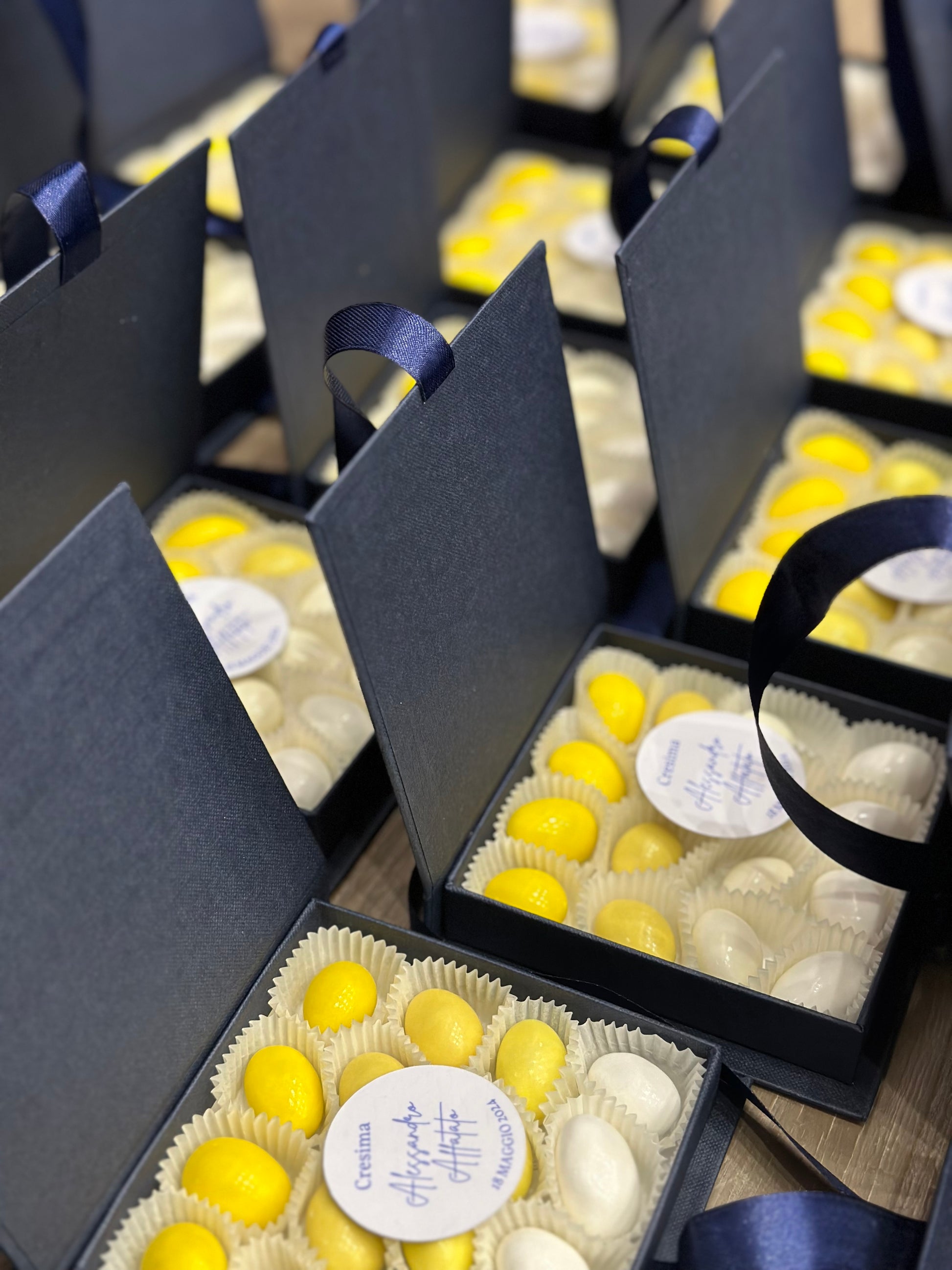 Scatola degustazione blu notte con 16 confetti sfumati dal giallo al bianco